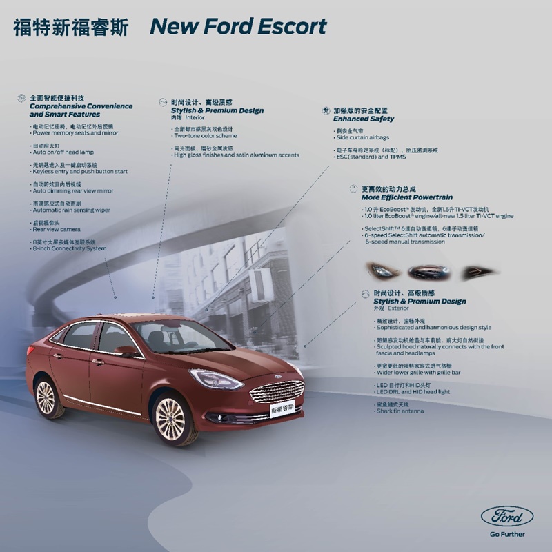 มาชมรถยนต์ 4 ประตู สัญชาติอเมริกันที่ออกจำหน่ายในประเทศจีนเท่านั้นกับ Ford Escort ที่พึ่งเปิดตัวรุ่น Minorchange ไปเมื่อวันที่ 10 เมษายนที่ผ่านมา เพื่อสานต่อตำนานของรุ่นก่อนหน้าซึ่งเปิดตัวเป็นครั้งแรก ในเดือนธันวาคม 2014 และสร้างยอดขายสะสมไว้สูงถึง 800,000 คัน โดยในคราวนี้มาพร้อมกับการปรับหน้าตาและอุปกรณ์ ส่วนเครื่องยนต์เบนซินมีให้เลือก 2 แบบ คือ 1.0 EcoBoost และ 1.5 Ti-VCT