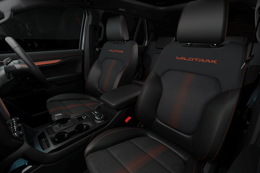 Ford Everest Wildtrak ยังมาพร้อมกับกระจังหน้าเฉพาะรุ่น และตกแต่งรอบคันด้วยสีดำตัดกับสีตัวถัง ล้อมีขนาด 20 นิ้ว เพิ่มความพิเศษด้วยการแซมสีส้มเอาไว้ ส่วนลูกค้าที่ชื่นชอบมาดสายลุย สามารถเลือกเปลี่ยนเป็นล้อขนาด 18 นิ้ว พร้อมยาง all-terrain โดยไม่มีค่าใช้จ่าย ห้องโดยสารเพิ่มความพิเศษด้วยเบาะกึ่งหนัง ปักชื่อ Wildtrak บนเบาะคู่หน้า และเดินตะเข็บด้ายสีส้มรอบคัน ทั้งยังมีเบาะแถวสามพับไฟฟ้า และหลังคา Panoramic Sunroof มาด้วย