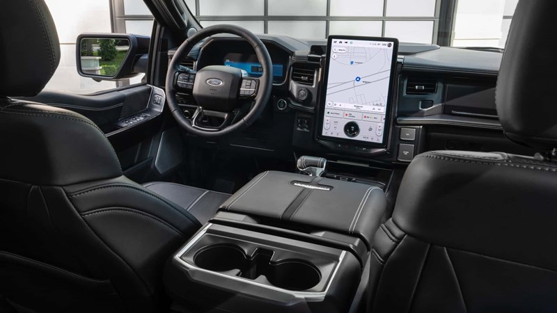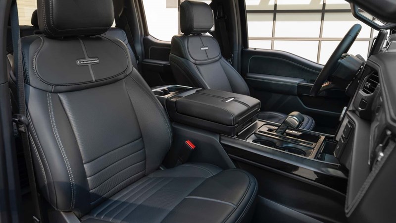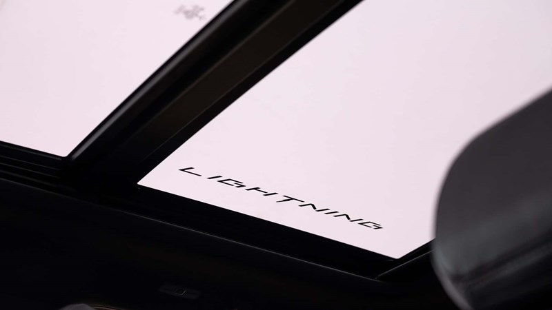 Ford F-150 Lightning Platinum Black Edition มีหลังคา Sunroof แบบคู่ พร้อมทั้งประทับตรา Lighting ไว้ด้วย วัสดุตกแต่งภายในเป็นหนัง Nirvana Leather สีดำ Luxe Black และยังมีเพลทอะลูมิเนียมระบุหมายเลขการผลิตจำนวนจำกัด ติดอยู่บนเสาประตูฝั่งคนขับ ส่วนขุมพลังเป็นระบบไฟฟ้า EV สามารถขับขี่เป็นระยะทางสูงสุดได้ 482 กิโลเมตร