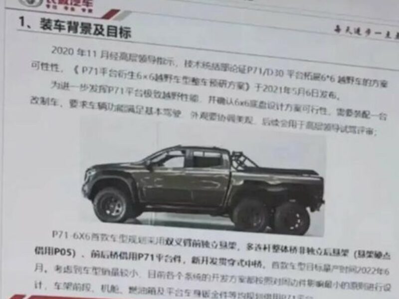 เมื่อพูดถึงรถหกล้อที่ไม่ใช่รถบรรทุก สิ่งที่หลายคนน่าจะนึกถึงคือ Mercedes-Benz G 63 AMG 6X6 แต่ในอนาคตอาจมีทางเลือกอื่นให้เราเห็นในชื่อ Great Wall Shanhai Canon 6×6 ซึ่งตอนนี้มีรถยนต์ทดสอบออกวิ่งในประเทศจีนแล้ว สอดคล้องกับรายงานก่อนหน้าที่มีสไลด์ที่ Great Wall Motors เปิดให้ตัวแทนจำหน่ายดูภาพว่า จะมีกระบะหกล้อตามมาในเดือนพฤษภาคม 2021 แต่ต้องเลื่อนออกไปเพราะโรคระบาด