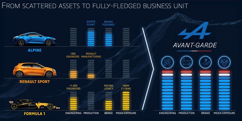 Alpine จะรวม Renault Sport Cars และ Renault Sport Racing เข้าด้วยกันพร้อมก้าวสู่ยุครถยนต์ไฟฟ้า 100% ด้วยการนำ platform แบบ CMF-B และ CMF-EV มาใช้ ทั้งยังตั้งเป้าคว้าแชมป์ในรถแข่ง F1 และผลิตรถสปอร์ตขุมพลังไฟฟ้า EV รุ่นถัดไปร่วมกับ Lotus พร้อมตั้งเป้าเริ่มทำกำไรได้ในปี 2025