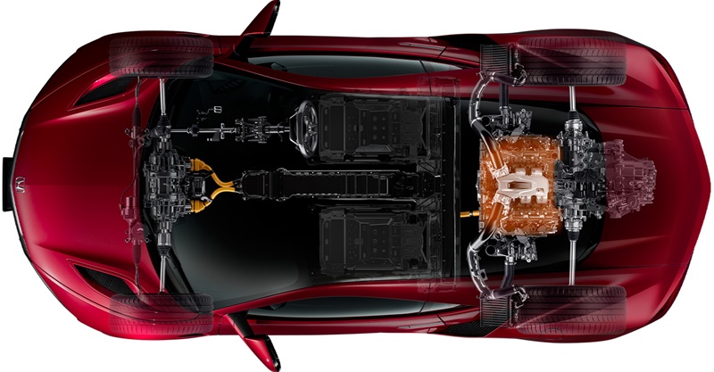 ขุมพลังของ Honda NSX เป็นเครื่องยนต์เบนซิน V6 3.5 ลิตร เทอร์โบคู่ พ่วงมอเตอร์ไฟฟ้า 3 ตัว ให้กำลังสูงสุดทั้งหมดรวมกัน 581 แรงม้า (PS) แรงบิดสูงสุด 646 นิวตันเมตร เกียร์อัตโนมัติ DCT 9 จังหวะ ส่งกำลังลงพื้นทั้ง 4 ล้อ ให้อัตราเร่ง 0-100 กิโลเมตร/ชั่วโมง ภายใน 2.9 วินาที ทำความเร็วสูงสุดได้ 307 กิโลเมตร/ชั่วโมง
