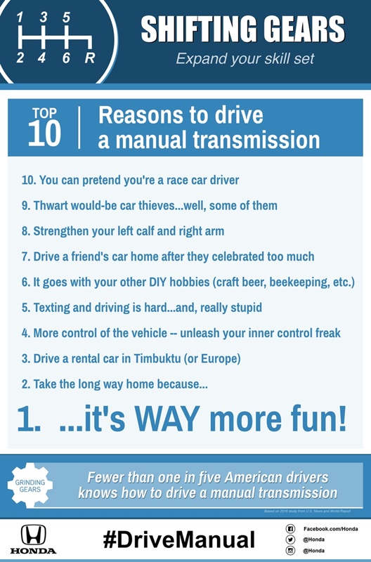 Honda สหรัฐฯ จัดกิจกรรม Shifting Gears ให้ลูกค้าได้สัมผัสประสบการณ์การขับขี่ รถยนต์เกียร์ธรรมดา หลังจากที่รถยนต์ประเภทดังกล่าวเริ่มหายไปจากตลาด เพราะมีสถิติระบุว่าน้อยกว่า 1 ใน 5 ของผู้ขับขี่ชาวอเมริกัน ขับรถยนต์ที่มีแป้นคลัชต์เป็น โดยในงานมีรถยนต์ Honda เกียร์ธรรมดา ให้ทดลองขับมากถึง 16 รุ่น ทั้งรุ่นปัจจุบัน และ รุ่นดังจากในอดีต ทั้งยังมีการเทรนให้กับผู้ที่ไม่คุ้นชินอีกด้วย