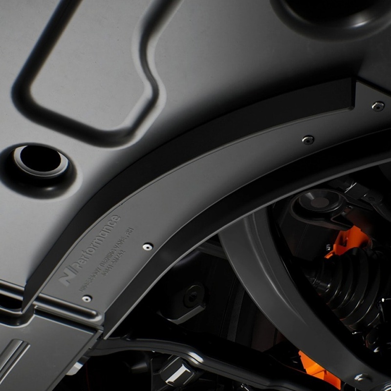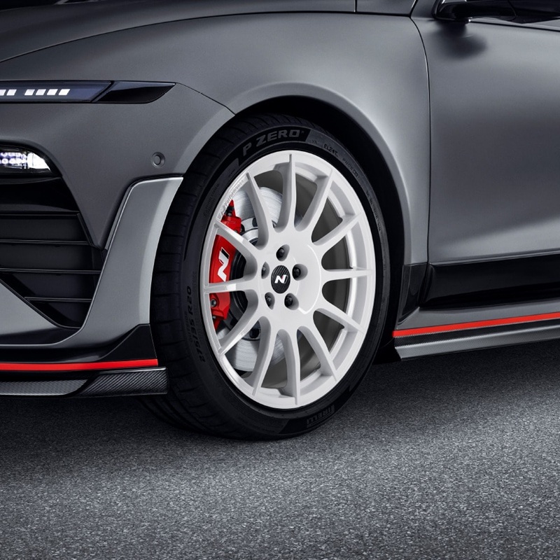 ชุดแต่ง Carbon Aero Package ใน IONIQ 6 N ยังเพิ่มชุดรีบครีบอากาศใต้ท้องรถ ช่วยทั้งเพิ่มแรงกดได้สูงสุด 16 กิโลกรัม และลดลมหมุนเวียนใต้ท้องรถ ส่วนล้อ Forged มีขนาด 20 นิ้ว ลาย 12 ก้าน มีให้เลือกทั้งสีขาวและสีดำ มีน้ำหนักวงละ 13.1 กิโลกรัม หรือ เบากว่าล้อเดิมวงละ 1.5 กิโลกรัม เพิ่มประสิทธิภาพการเข้าโค้งและการเร่ง ทั้งยังสามารถสั่งเพิ่ม ฝาปิดดุมล้อทำจากคาร์บอน, น็อตล้อสีดำ และ ลายกราฟฟิกตกแต่งรอบคัน