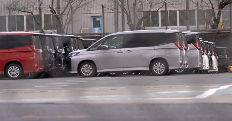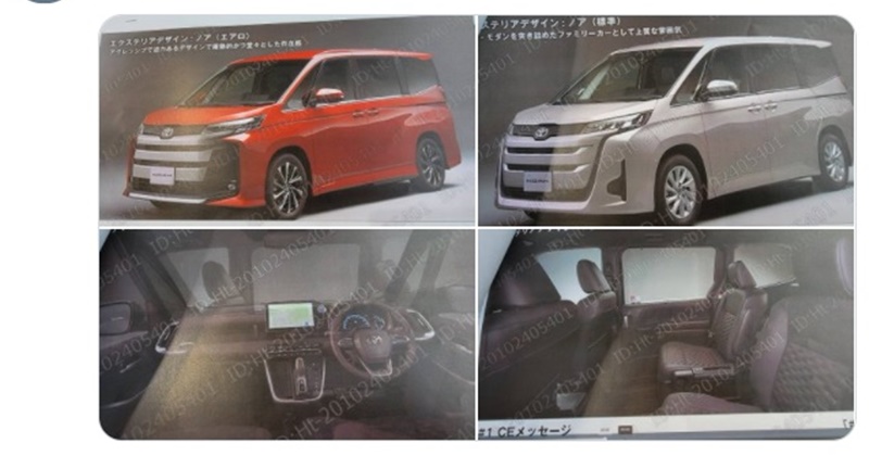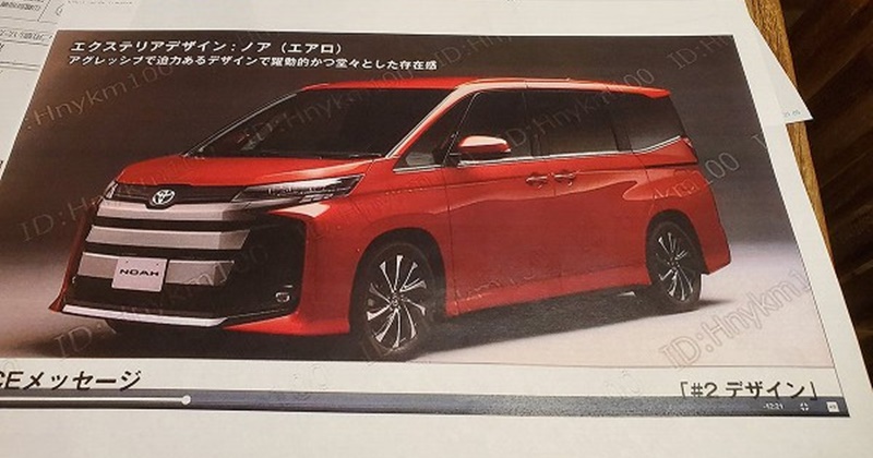 เริ่มต้นกับ Toyota Noah กันก่อน โดยในภาพคือรุ่นที่ไฟหน้ามีขนาดใหญ่กว่า และมีกระจังหน้าแนวนอนซี่หนา 3 ชั้น พร้อมตัดสีเทาให้ต่างจากสีภายนอก ตัวถังมีสีใหม่อย่างสีแดง Red Mica Metallic มาด้วย สอดคล้องกับภาพหลุดที่มีก่อนหน้านี้ ส่วนสียอดนิยมอย่างสีขาว White Pearl Crystal Shine ยังคงอยู่ ไฟท้ายเป็นสีแดง และล้อสีเทา