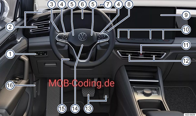 ห้องโดยสารของ Volkswagen Tiguan รุ่นถัดไป มาพร้อมกับพวงมาลัยสามก้านพร้อมเกียร์คอ หนึ่งในจุดเด่นคือหน้าจอสัมผัสขนาดใหญ่สุด 15 นิ้ว ส่วนปุ่มหมุนตรงคอลโซลเกียร์คือ Driving Experience Switch สำหรับใช้ปรับค่าต่างๆ ภายในรถยนต์ไม่ว่าจะเป็นเครื่องเสียง, การตอบสนองของระบบส่งกำลัง, เครื่องยนต์ และไฟส่องสว่างในห้องโดยสาร Ambient Lighting