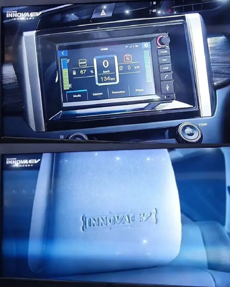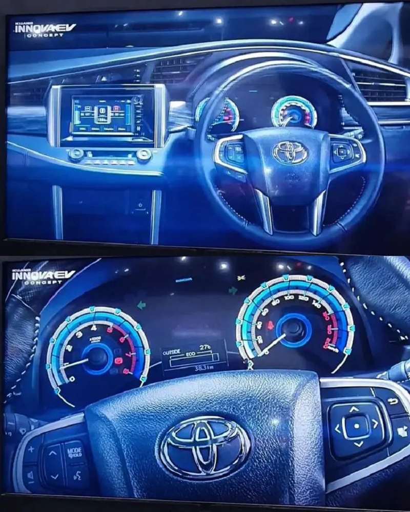 ห้องโดยสารเปลี่ยนมาตรวัดใหม่ดูทันสมัยขึ้น โดยมีแถบวัดความประหยัด ECO แต่ที่น่าประหลาดคือมีมาตรวัดรอบเครื่องยนต์มาให้ในรถยนต์ไฟฟ้าคันนี้ด้วย หน้าจอกลางแดชบอร์ดปรับแต่งใหม่ให้แสดงค่าที่เกี่ยวข้องกับระบบไฟฟ้า EV บนพนักพิงศีรษะมีการประทับชื่อรุ่น ส่วนรายละเอียดเชิงเทคนิคยังไม่มีหลุดมาด้วย ซึ่งเราจะรีบมารายงานให้ทราบอีกครั้งหลัง Toyota Innova EV Concept เปิดตัวในอีกไม่นานนับจากนี้