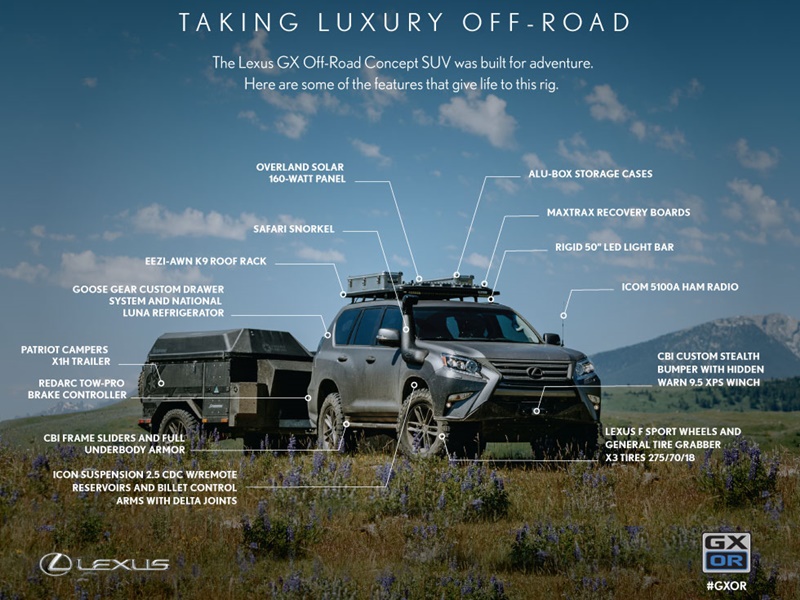 Lexus GXOR Concept มาในตัวถังสีด้าน เสริมด้วยสารพัดอุปกรณ์จากผู้ผลิตชื่อดังหลายรายการ ไม่ว่าจะเป็นกันชนหน้าทรงใหม่ ที่ซ่อนสายลากรถ WARN เอาไว้, สน็อกเกิ้ล Safari, บันไดข้าง, แผ่นปิดกันกระแทกใต้ท้อง CBI, ไฟ LED ส่องสว่างบนหลังคา 50 นิ้ว จาก RIGID และเสาส่งสัญญาณวิทยุ ICOM