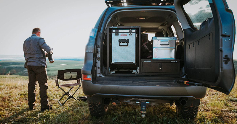 ล้อเป็นของ Lexus F Sport ขนาด 18 นิ้ว รัดด้วยยาง ขนาด 275/70 ช่วงล่างยกสูงขึ้นมาอีก 2.5 นิ้ว พร้อมปรับแต่งจุดเชื่อมต่อใหม่ ส่วนบนหลังคาอเนกประสงค์ด้วยสารพัดอุปกรณ์ทั้ง ราวหลังคาพร้อมกล่องเก็บของอะลูมิเนียม และแผง Solar Cell ขนาด 160 วัตต์