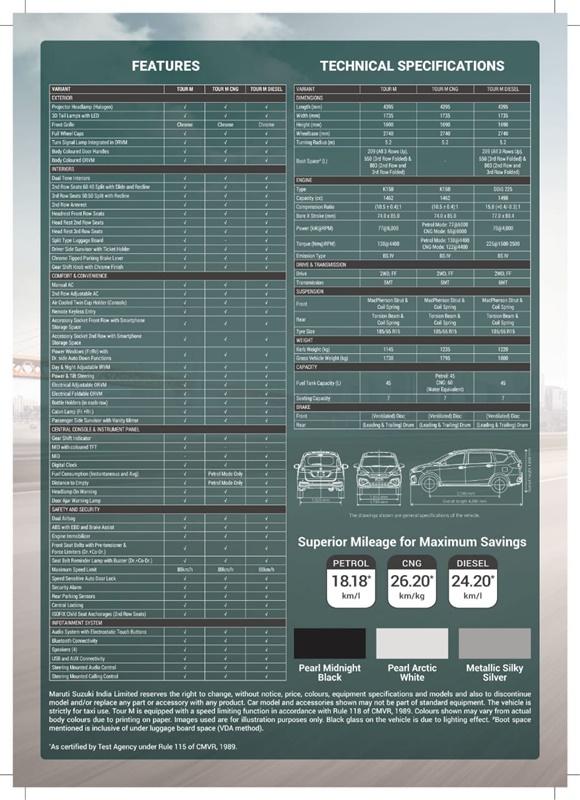 Maruti Tour M มีให้เลือกสีตัวถังเพียง 3 สี ซึ่งน้อยกว่า Suzuki Ertiga ประกอบด้วย สีดำ Pearl Midnight Black, สีขาว Pearl Arctic White และ สีเทา Metallic Silky Silver ด้านอุปกรณ์มาตรฐานให้มาตามสมควรทั้ง ไฟหน้า Projector, ไฟท้าย LED แบบ 3D และมือเปิดประตูสีเดียวกับตัวรถ ส่วนล้อมีขนาด 15 นิ้ว มาพร้อมกับฝาตบแบบเต็มวง