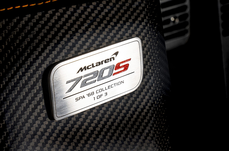 แน่นอนว่า รถยนต์รุ่นพิเศษๆต่างๆที่เกิดขึ้นของ McLaren คงไม่พ้นฝีมือจากฝ่าย McLaren Special Operation – MSO เช่นเดิม โดยสำหรับ 720S Spa 68 Collection มาพร้อมกับตัวถังภายนอกสีส้มพิเศษ ที่ใช้ชื่อเรียกว่า MSO Bespoke Anniversary Orange ซึ่งเป็นเฉดเดียวกับ McLaren M7A รถแข่ง F1 ที่ใช้คว้าชัยชนะครั้งแรก