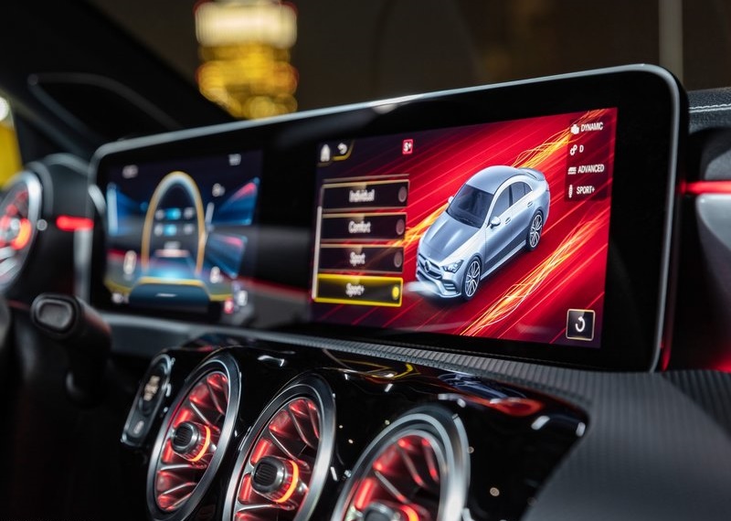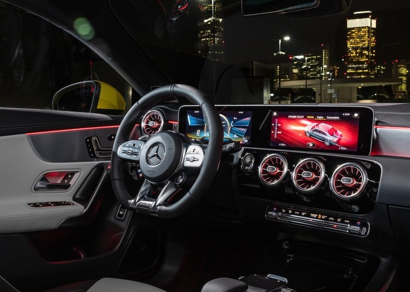 ห้องโดยสารของ Mercedes-AMG CLA 35 4MATIC ตกแต่งด้วยวัสดุหนัง ARTICO สีดำ หรือ สีเทาเข้ม ตัดด้วยผ้า microfiber แบบ DINAMICA สีดำ เพิ่มความสะดุดตา ด้วยการใช้สีแดงตัดรอบคันทั้ง การเดินด้าย, เข็มขัดนิรภัย, และคิ้วช่องลม ส่วนคอลโซลตกแต่งด้วยสีดำเงา Piano Lacquer