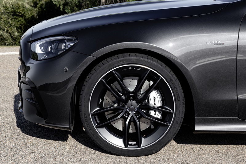 Mercedes-AMG E 53 4MATIC+ มาพร้อมกับกระจังหน้าแนวตั้ง 12 ช่องสไตล์ AMG รับกับดีไซน์ด้านหน้าแบบ A-shaped และช่องดักลมกลางกันชนแนวตั้ง 5 ช่อง ท่อไอเสียเป็นแบบปลายกลมคู่ออกสองฝั่ง มีทั้งสีเงินและสีดำ ฝาท้ายเสริม lip spoiler ขนาดเล็กสีเดียวกับตัวถังหรือคาร์บอนไฟเบอร์ ล้อมีขนาด 19 – 20 นิ้ว ส่วนสีตัวถังที่เพิ่มมาใหม่มีทั้ง สีเทา Graphite Grey Metallic และ สีน้ำเงิน Matt Brilliant Blue Magno