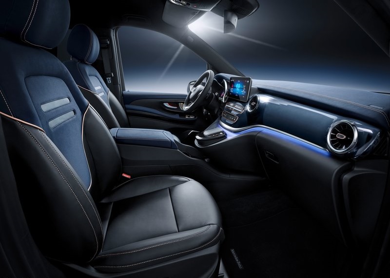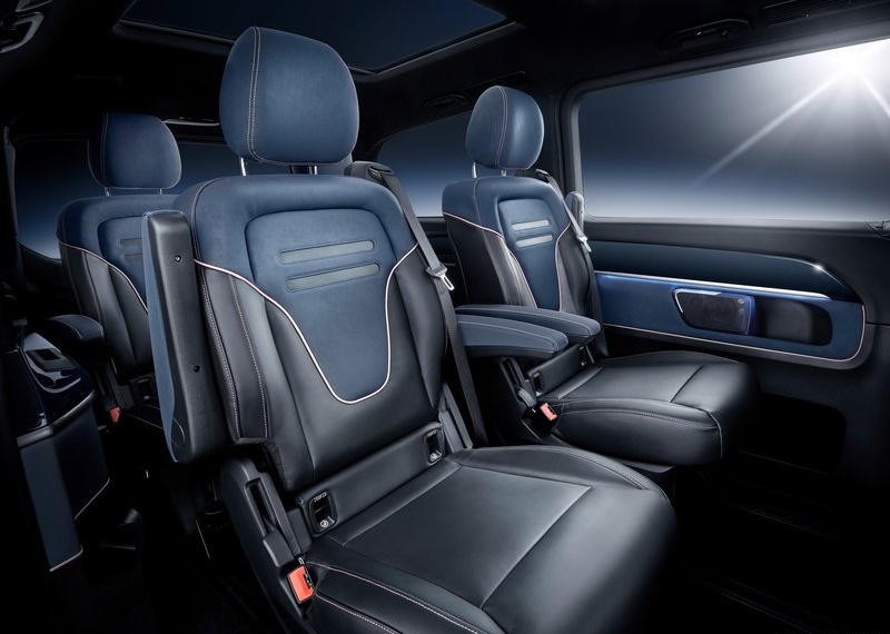 ด้วยความที่เป็นรถยนต์ไฟฟ้าที่ติดตั้งแบตเตอรี่ไว้ใต้พื้นรถ ภายในจึงมีพื้นที่กว้างขวาง รองรับผู้โดยสารได้ 6 – 8 ที่นั่ง ขึ้นอยู่กับการจัดวางเบาะ การตกแต่งเน้นใช้วัสดุหนัง Nappa สีน้ำเงินและวัสดุโครมเมี่ยม พร้อมตัดด้วยการนำสีดำและสี Rose Gold มาใช้ เครื่องเสียงขาดไม่ได้กับ MBUX ระบบสั่งการด้วยเสี่ยงอัจฉริยะ ที่ให้ผู้ใช้งานสั่งการระบบต่างๆ ด้วยการใช้คำพูดตามปกติ