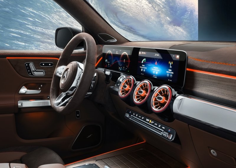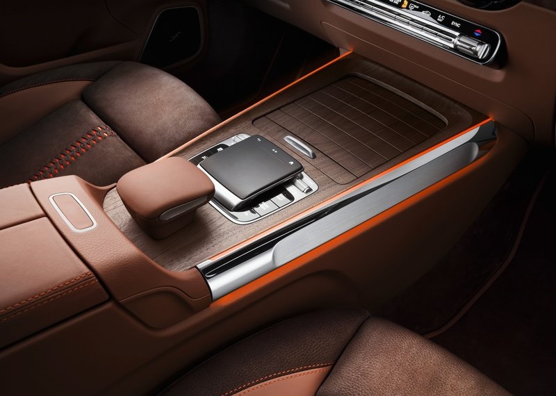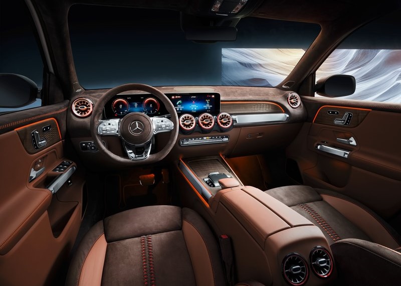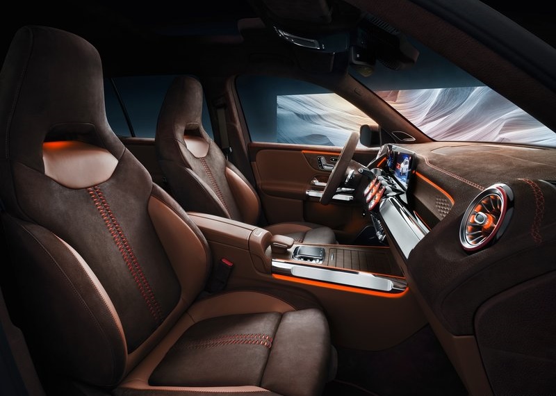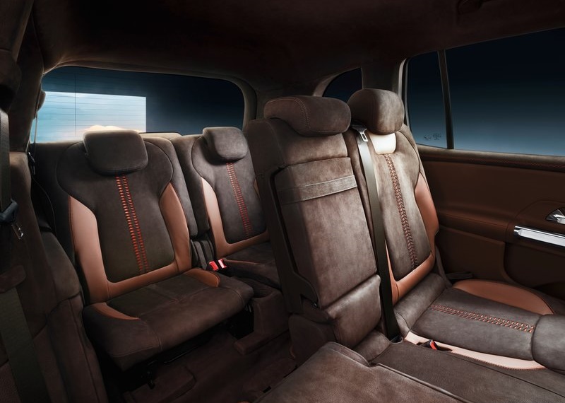แม้จะจัดอยู่ในรถยนต์ขนาด Compact แต่ห้องโดยสารของ Mercedes-Benz Concept GLB ตกแต่งอย่างประณีต ดูเรียบหรูในโทนสีน้ำตาล Chestnut Brown อัดแน่นด้วยหนัง Nappa และ Nubuk รอบคัน ตัดด้วยลายไม้ Walnut, วัสดุอะลูมิเนียมปัดเงา และสอดแทรกสีส้มไว้ เพื่อให้รับกับการตกแต่งภายนอก