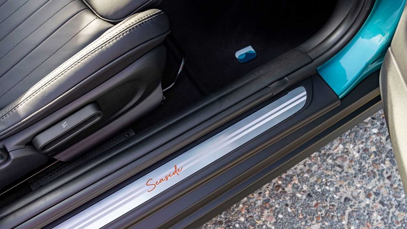 MINI Convertible Seaside Edition มาพร้อมกับล้อลาย Pulse Spoke ขนาด 18 นิ้ว เสริมด้วยฝาปิดดุมล้อเฉพาะรุ่น ด้านหน้ามีกราฟฟิกเฉพาะรุ่นอยู่บนกันชนใต้กระจังหน้า ด้านข้างเสริมแถบกราฟฟิกคาดยาวจากแก้มหน้าถึงท้ายรถ ที่ครีบแก้มคู่หน้าและฝาท้ายมีโลโก้ Seaside บ่งบอกความพิเศษ เมื่อเปิดประตูมาจะเจอกันเตะที่ระบุชื่อรุ่นเช่นกัน