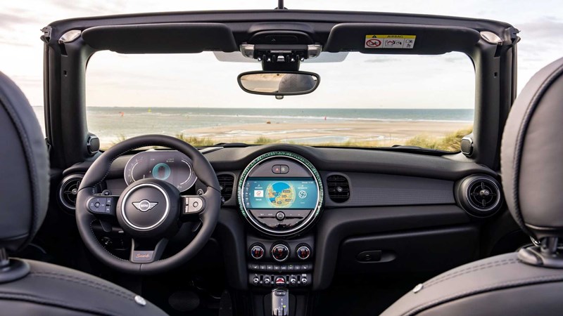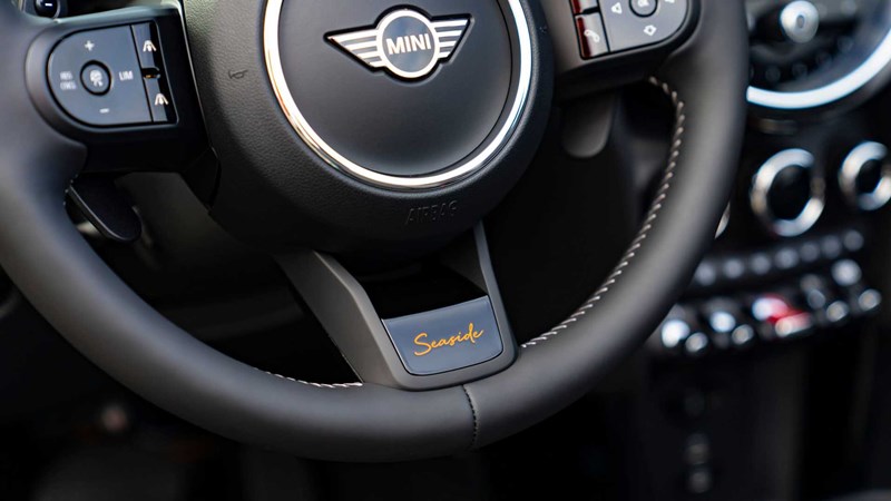 ห้องโดยสารของ MINI Convertible Seaside Edition นำหนังสีดำ Carbon Black มาหุ้มเบาะ, ที่วางแขน และที่พิงเข่า ซึ่งนี่เป็นสีที่ตัดกับสีตัวถังพิเศษเป็นอย่างดี บนแดชบอร์ดยังมีกราฟฟิกเฉพาะรุ่น รวมถึงมีโลโก้รุ่นอยู่ที่ก้านของพวงมาลัย sports steering หุ้มหนังด้วย ส่วนเครื่องเสียงทำงานร่วมกับระบบปฏิบัติการ MINI Operating System เวอร์ชั่นล่าสุด