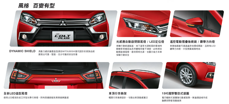 Mitsubishi Colt Plus Minorchange มาพร้อมกับหน้าใหม่แบบ Dynamic Shield ทั้งยังมีการไฟหน้าเปิด – ปิดอัตโนมัติพร้อมไฟ position แบบ LED, ไฟท้าย LED แบบใหม่, ราวหลังคา, กระจกมองข้างปรับ-พับไฟฟ้าพร้อมไฟเลี้ยว LED และล้อลายใหม่ขนาด 15 นิ้ว