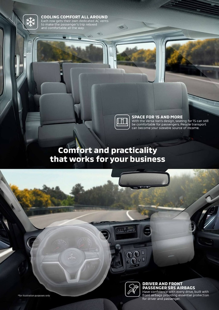 Nissan Urvan ได้รับการปรับเปลี่ยนโลโก้และชื่อรุ่นใหม่เป็น Mitsubishi Versa Van เพื่อเปิดตัวที่ฟิลิปปินส์ เมื่อวันที่ 6 กุมภาพันธ์ 2026 สานต่อตำนานรถขนคน ที่ชาวฟิลิปปินส์คุ้นชินตั้งแต่ยุค 1987 ซึ่งใช้งานวิศวกรรมร่วมกับ L300 พร้อมตอบโจทย์ผู้ประกอบการรถยนต์ขนคนเพื่อการพาณิชย์ ในส่วนของรายละเอียดมิติตัวถัง มีดังต่อไปนี้