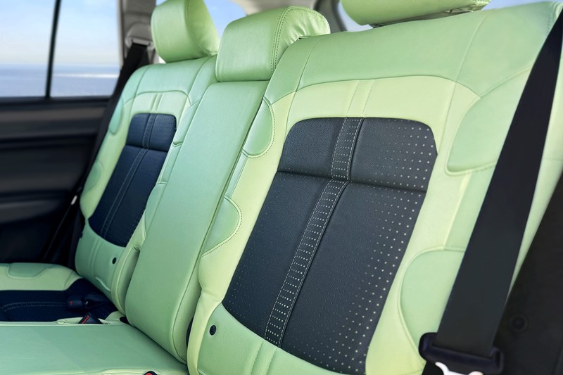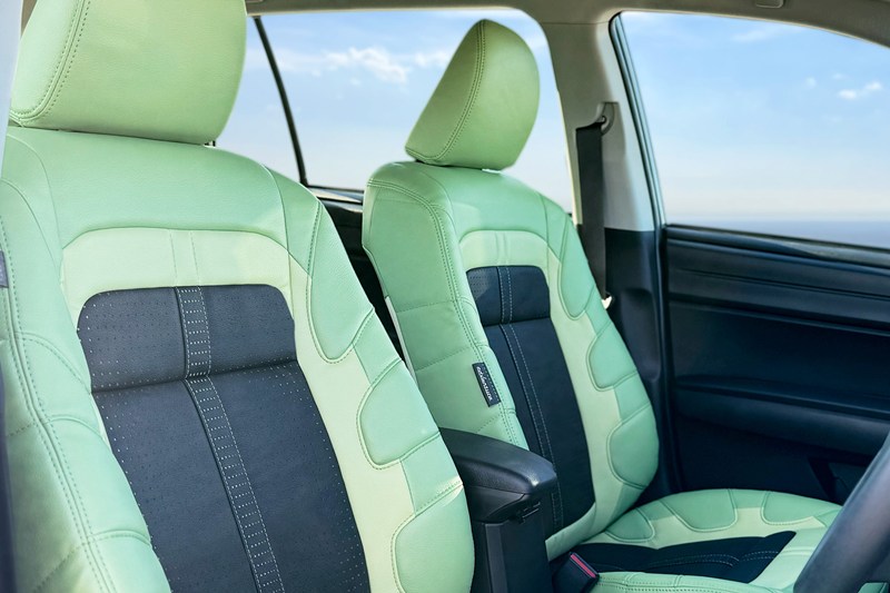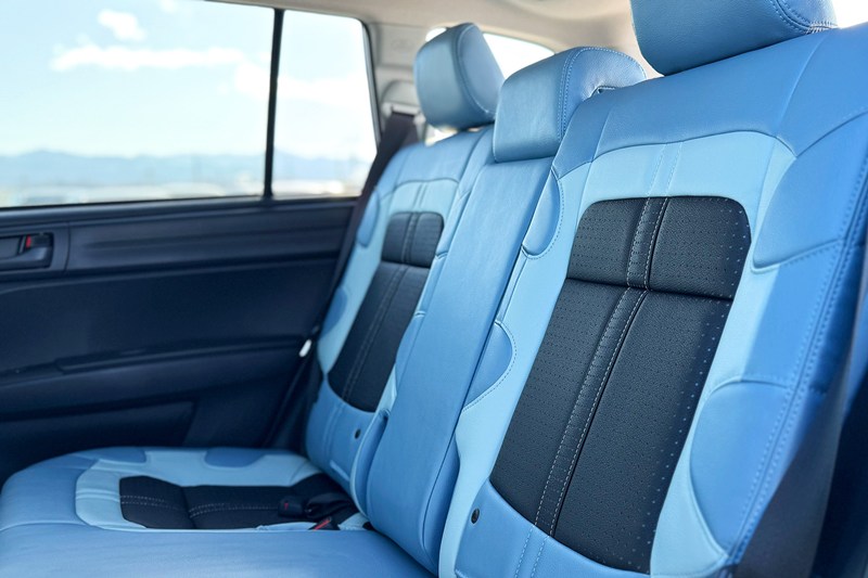 ความพิเศษยังมีในห้องโดยสารด้วย โดยสีของเบาะ Mitsuoka Ryugi Wagon Adventure จะเปลี่ยนตามสีภายนอก ซึ่งถ้าสั่งตัวถังสีเขียวเบาะก็จะสีเขียว และถ้าสั่งรถสีฟ้าเบาะจะมาในสีน้ำเงิน โดยวัสดุเป็นหนังสังเคราะห์ตัดเย็บลายเฉพาะรุ่น ตรงกลางตัดด้วยสีดำ พวงมาลัยเป็นยูรีเทนทรง 3 ก้าน สำหรับอุปกรณ์มาตรฐานที่เหลือมีระบบปรับอากาศแบบ Manual, เครื่องเสียง 4 ลำโพง และระบบช่วยเหลือผู้ขับขี่
