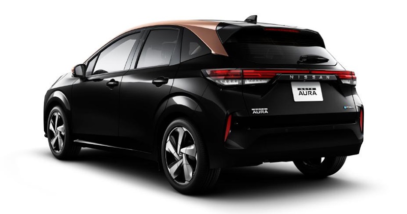 Nissan Note Aura พลิกดีไซน์ใหม่กับกระจังหน้า V-Motion รับกับแถบไฟ LED ที่เป็นทั้ง DRL และ ไฟเลี้ยวแบบ Sequential ด้านข้างเสริมกาบซุ้มล้อให้ดูกว้างขึ้น เข้ากับล้อลายใหม่ขนาด 17 นิ้ว ด้านหลังเปลี่ยนไฟท้ายใหม่ มีแถบทับทิมเชื่อมต่อกันตลอดแนว ปิดท้ายด้วยทางเลือกสีตัวถัง 14 สี รวมถึง two-tone อย่างสีแดง Garnet Red – สีดำ Super Black และ สีดำ Midnight Black – สีทอง Sunrise Copper