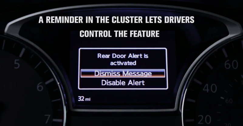 หนึ่งในความสูญเสียที่ปรากฏในสื่อเป็นระยะๆ คือข่าวเด็กเสียชีวิตหลังถูกลืมทิ้งเอาไว้ที่เบาะหลังในรถยนต์ที่ล็อคประตูเอาไว้ จนขาดอากาศหายใจและปัญหานี้เป็นสิ่งที่ Nissan ในประเทศสหรัฐฯ ตระหนักเช่นกัน เนื่องจากอุณหภูมิภายในห้องโดยสารของรถยนต์ที่จอดตากแดดไว้จะสูงขึ้นอย่างรวดเร็ว จนนำไปสู่การเสียชีวิตของเด็กที่ถูกลืมเอาไว้ จึงนำไปสู่การพัฒนาระบบ Rear Door Alert เพื่อป้องกันการเกิดเหตุดังกล่าว