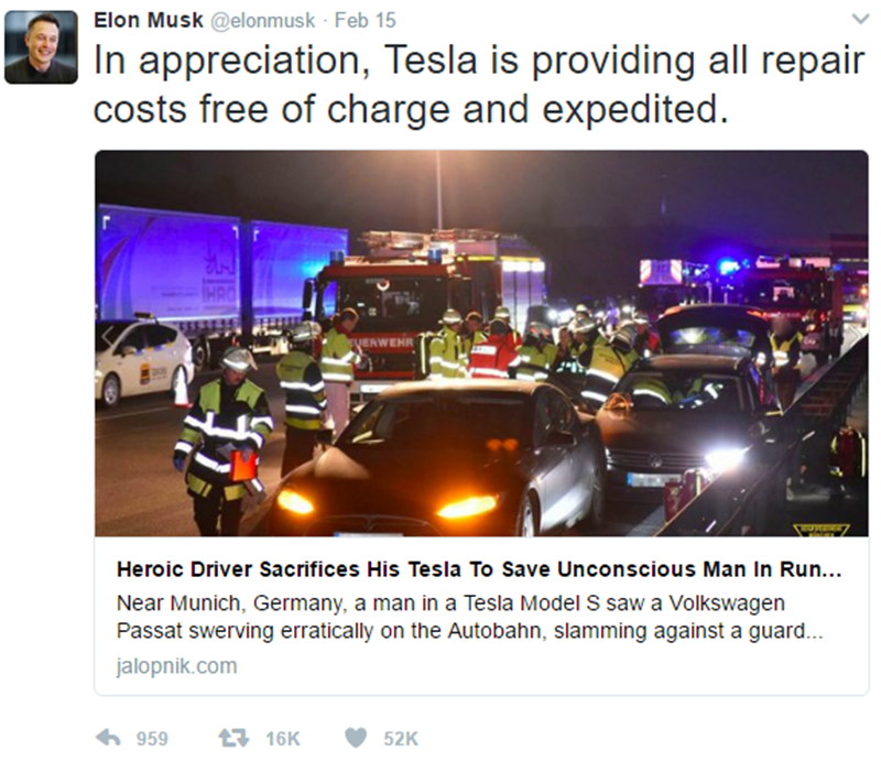 สละตนด้วยการเสนอซ่อมแซม Tesla Model S ให้โดยไม่คิดค่าใช้จ่ายใดๆทั้งสิ้น นับว่าเป็น