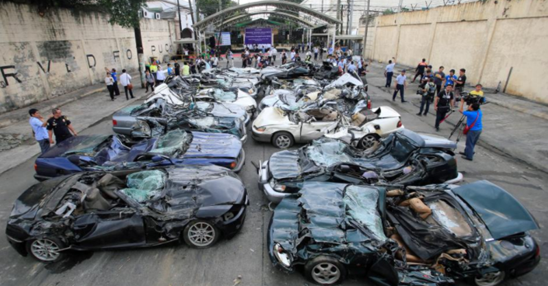 รถยนต์ที่ถูกนำมาทำลายในครั้งนี้ มีจำนวนทั้งสิ้น 30 คัน คิดเป็นมูลค่าทั้งหมด 61,626,000 เปโซฟิลิปปินส์ (ราว 37,797,000 บาท) โดยคันที่มีมูลค่าสูงสุดอยู่ที่ 5,940,000 เปโซฟิลิปปินส์ (ราว 3,643,000 บาท) สำหรับรถยนต์ที่ถูกนำมาทำลาย ล้วนเป็นรถยนต์หรูและรถยนต์หายาก เช่น Toyota Prado, Mercedes-Benz S-Class, Jaguar S-Type, BMW Z3 และ 1969 Chevrolet Corvette