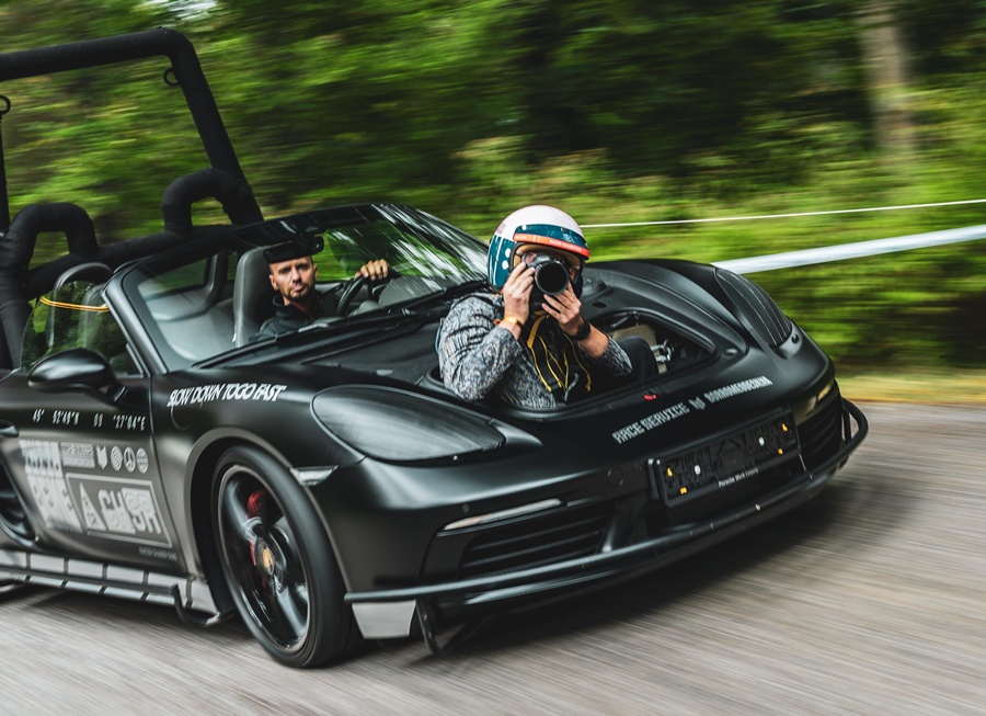 การได้มาซึ่งภาพ rolling shot สวยๆ ของรถสปอร์ตขณะใช้ความเร็วสูง ย่อมต้องใช้รถตากล้องที่มีสมรรถนะไม่ด้อยไปกว่ากัน เป็นเหตุให้ Porsche คิดโครงการรถตากล้องคันใหม่ขึ้นมาในปี 2017 เพื่อทดแทน ‘buggy’ รถตากล้องคันเดิมที่มีพื้นฐานมาจาก Porsche Boxster รุ่นเก่า และมีสมรรถนะไล่ตามรุ่นใหม่ไม่ทัน คันในภาพจึงถือกำเนิดโดยมีพื้นฐานมาจาก Porsche 718 Boxster S และที่น่าสนใจคือทุกวันนี้ รถยนต์คันนี้ยังคงทำหน้าที่เป็นรถตากล้องอยู่