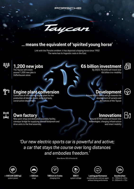 รถยนต์ไฟฟ้าต้นแบบคันแรกของค่ายอย่าง Porsche Mission E ใกล้ที่จะออกสู่ตลาดแล้ว โดยผู้ผลิตได้ประกาศชื่อที่ใช้ในการจำหน่ายจริงว่า Porsche Taycan ซึ่งหมายถึง ม้าวัยเยาว์ที่ร่าเริง สะท้อนให้เห็นถึงตัวตันของรถยนต์ไฟฟ้าคันนี้ ที่สวมวิญญาณรถสปอร์ต และเต็มเปี่ยมไปด้วยอิสระ เพราะเดินทางได้เป็นระยะทางไกล