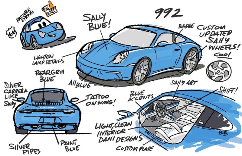 Sally Carrera ในปี 2022 จะไม่ได้เป็นแฝดของเวอร์ชั่นการ์ตูนในปี 2002 แต่เป็นการจินตนาการว่าเธอจะเป็นอย่างไรในปัจจุบัน ดังนั้น พื้นฐานจะไม่ได้เป็น Porsche 911 ตัวถัง 996 เหมือนในหนัง แต่จะเป็นรุ่นปัจจุบันในรหัส 992 และตกแต่งโดยใช้แรงบันดาลใจมาจากการ์ตูนทั้ง สีฟ้า Sally Blue Metallic และ ล้อลายใบพัด 5 ก้าน