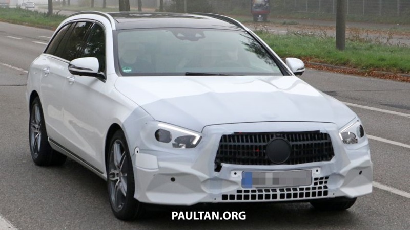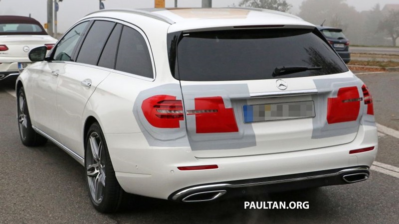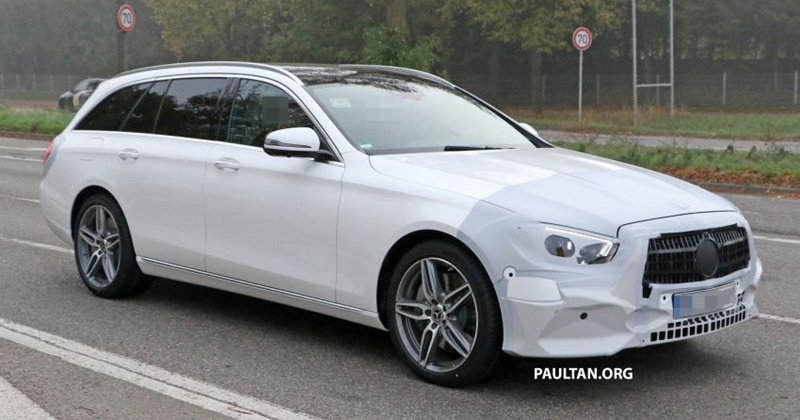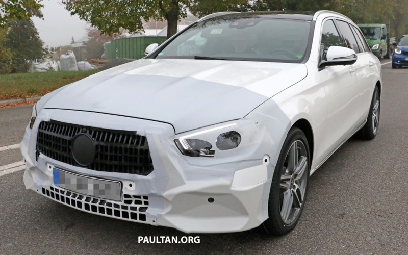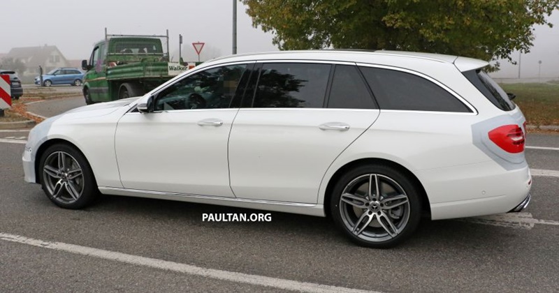 Mercedes-Benz E-Class facelift ที่ถูกจับภาพได้ก่อนใครเพื่อนมาในตัวถัง Estate ผ่านการอำพรางด้านหน้าอย่างมิดชิด แต่ยังพอจะเห็นไฟ LED DRL ทรงใหม่แบบเดียวกับที่พบใน A-Class และ CLS-Class รุ่นล่าสุด กระจังหน้าคาดว่าจะมีเหลี่ยมกว่าเคย โดยรับอิทธิพลมาจาก CLS-Class