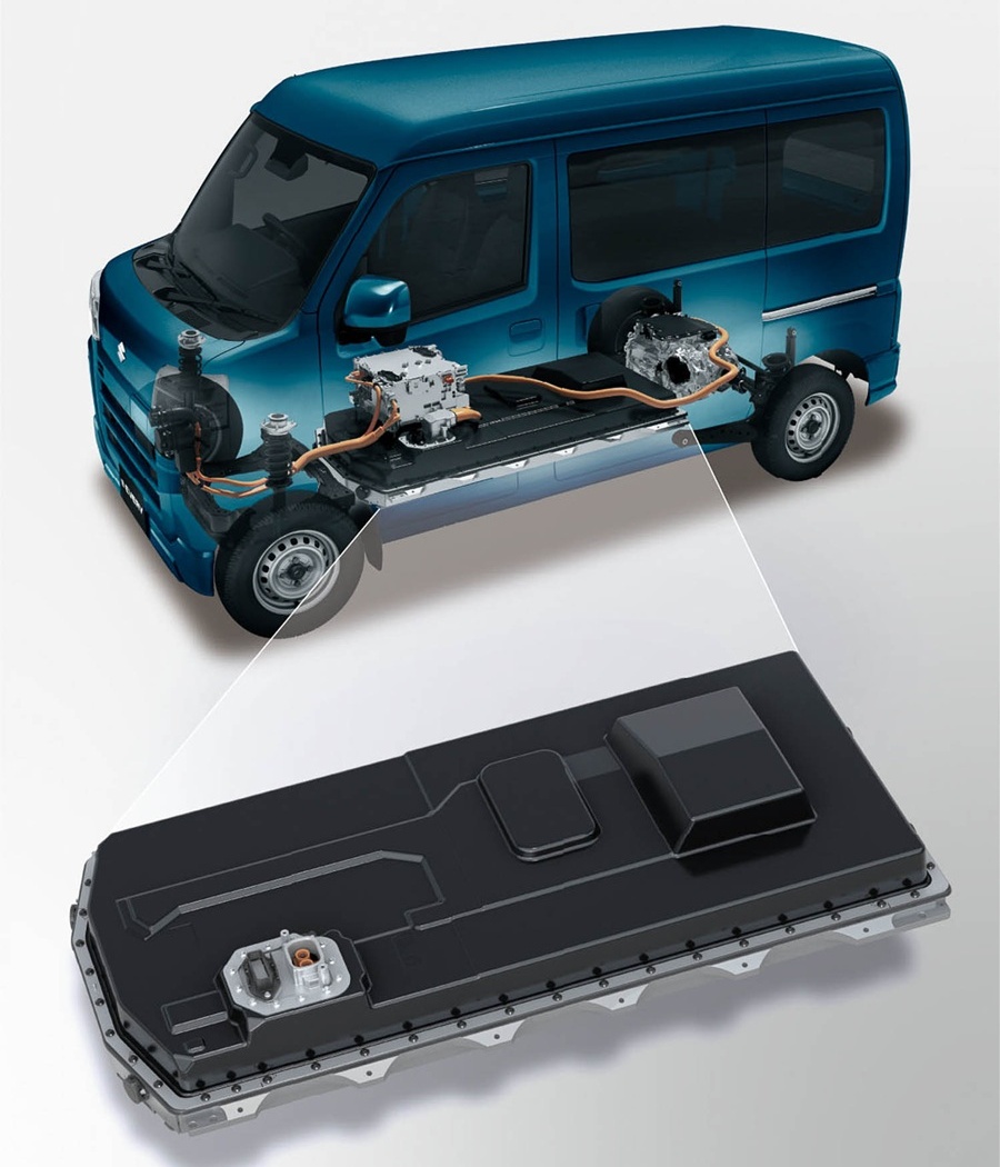 ขุมพลังของ Suzuki e Every เป็นระบบไฟฟ้า EV ประกอบด้วย eAxle ซึ่งควบรวมมอเตอร์ไฟฟ้า, inverter และ เพลาขับเข้าด้วยกัน กำลังสูงสุด 64 แรงม้า แรงบิดสูงสุด 126 นิวตันเมตร ขับเคลื่อนสองล้อหลัง แบตเตอรี่ lithium iron phosphate มีขนาด 36.6 kWh ติดตั้งใต้ท้องรถ ช่วยลดจุดศูนย์ถ่วงให้ต่ำลง ขับขี่ได้ไกลสุดเป็นระยะทาง 257 กิโลเมตร ตามมาตรฐาน WLTC ส่วนน้ำหนักบรรทุกสูงสุดอยู่ที่ 350 กิโลกรัม