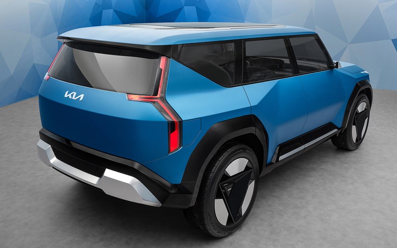 Kia EV9 คันผลิตจริงที่ยังถูกอำพรางอยู่ ดูไม่แตกต่างจากเวอร์ชั่นรถยนต์ต้นแบบเท่าใดนัก โดยยังคงเอกลักษณ์ตัวถังทรงกล่องเอาไว้ รวมถึงไฟหน้าแนวตั้งทรงเฉี่ยว ชายล่างตัวถังยังตัดสีดำรวมถึงโป่งล้อ กระจกมองข้างกลับมาในคันจริง แตกต่างจาก Concept Car ส่วนมือเปิดประตูเป็นแบบจมลงในตัวถัง ด้านหลังยังไม่มีภาพมาให้ด้วย แต่คาดเดาว่าไม่น่าต่างจากคันโชว์