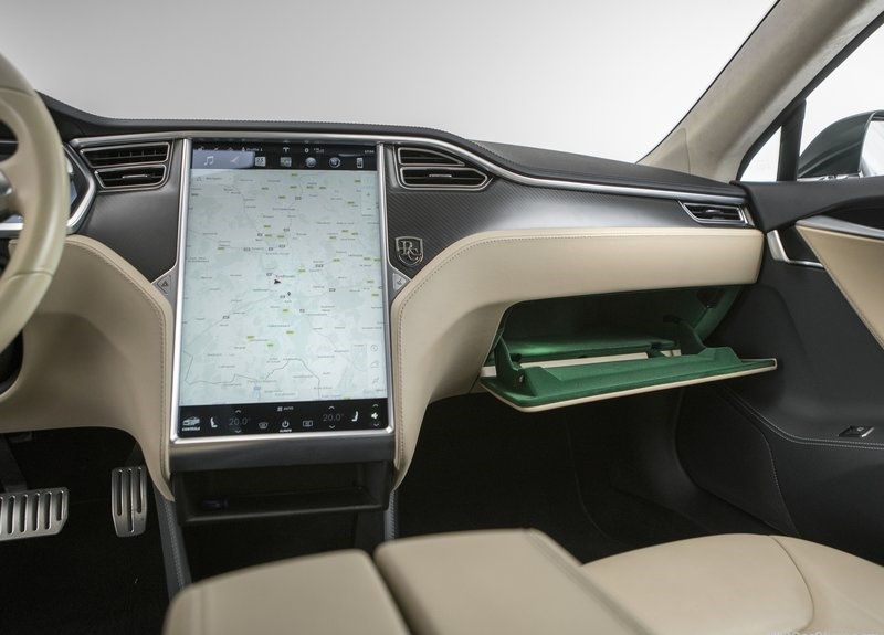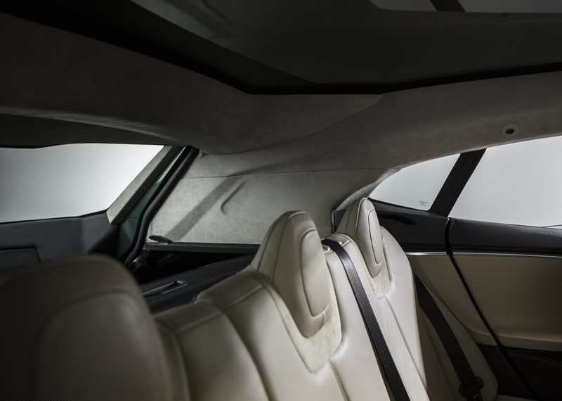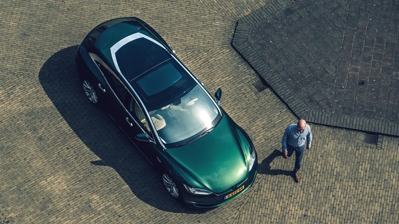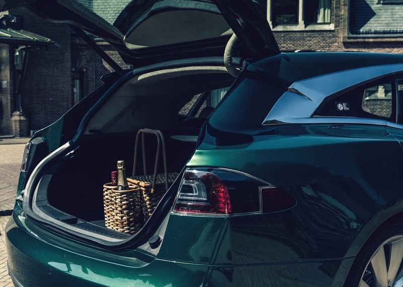 Tesla Model S Shooting Brake มาพร้อมกับหลังคา Panoramic Sunroof ส่วนสีตัวถัง พัฒนาขึ้นมาใหม่ในสีเขียวประกายทอง Green Metallic with twist of Gold ตามความประสงค์ของ de Raadt ให้ดูสง่าไม่เหมือนใคร พร้อมตัดสีตัวถังด้วย คิ้วโครเมี่ยมที่ลากยาวตลอดแนวหลังคา โดยเริ่มต้นตั้งแต่เสา A – pillar จนไปบรรจบที่ด้านหลัง