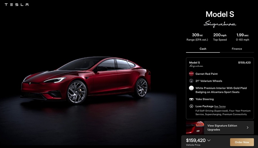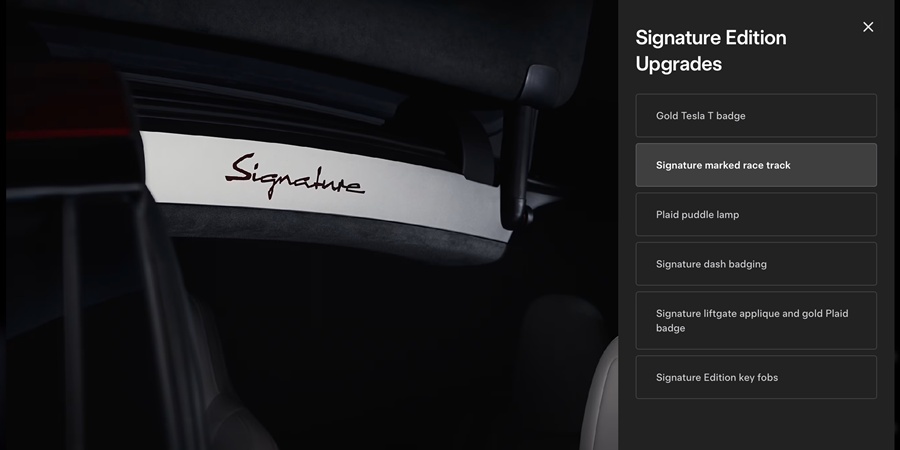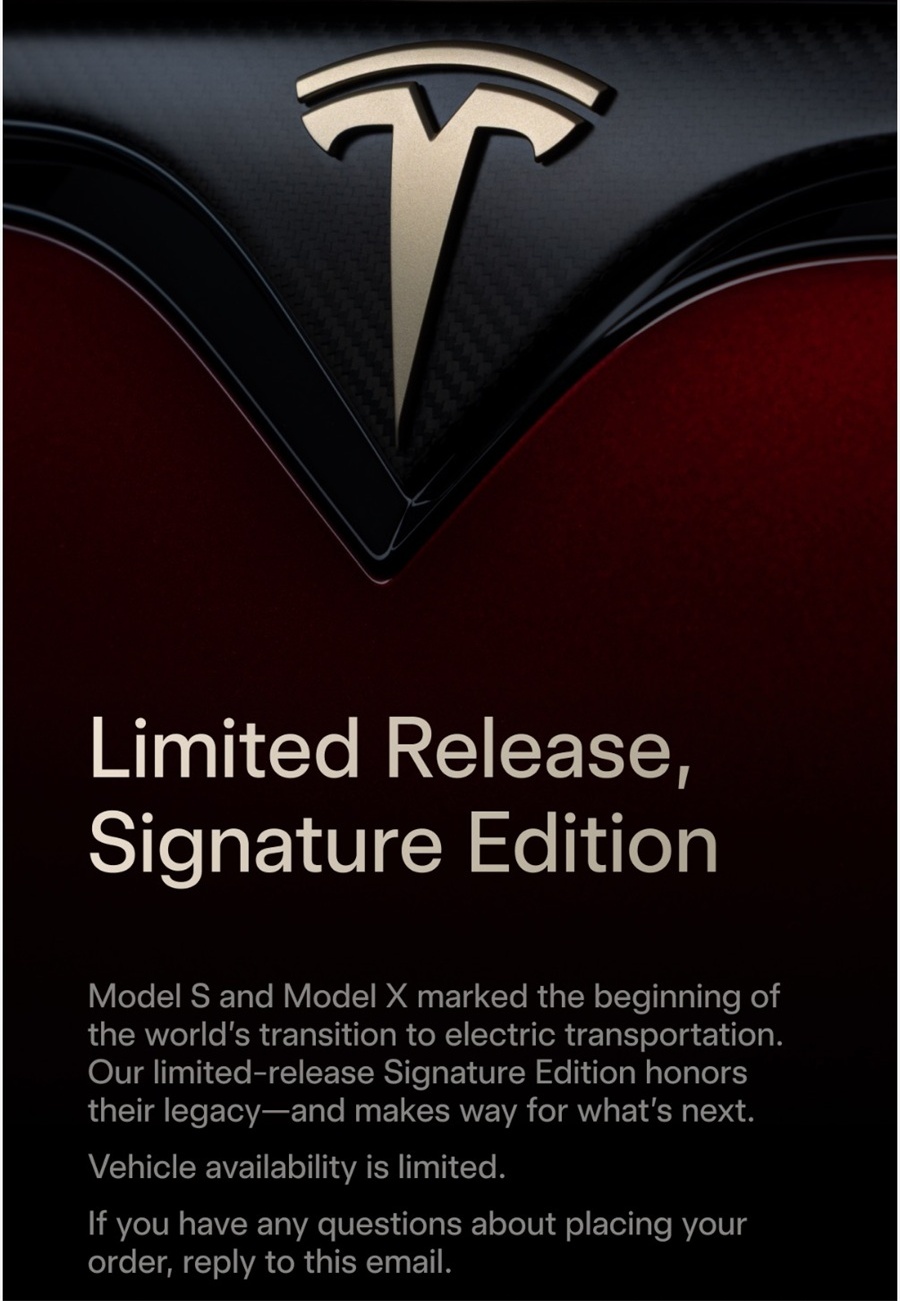 หลังจากที่มีการยืนยันว่า Tesla Model S และ Model X ได้ยุติการผลิตลงไปเป็นที่เรียบร้อยแล้ว ตามมาด้วยข่าวการปรับขึ้นราคารถยนต์ที่เหลืออยู่ในสต็อกของสหรัฐฯ ล่าสุด มีความเคลื่อนไหวเพื่อเป็นการส่งท้าย EV สองรุ่นนี้อีกครั้งกับรุ่นพิเศษในชื่อ Signature Edition มาพร้อมกับการตกแต่งพิเศษทั้งภายนอกและภายใน ผลิตจำนวนจำกัดเพียง 350 คัน โดยแบ่งเป็น Model S จำนวน 250 คัน และ Model X จำนวน 100 คัน ส่วนที่มาของชื่อนั้น Signature เป็นชื่อที่เคยใช้กับ Model S 1,000 คันแรก ที่ออกขายตอนเปิดตัวในปี 2012