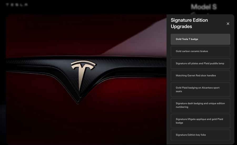 Tesla Model S และ Model X Signature Edition มีพื้นฐานมาจากรุ่นย่อย Plaid ทั้งคู่ พร้อมเพิ่มความพิเศษด้วยตัวถังสีแดง Garnet Red ซึ่งเป็นสีใหม่ที่พัฒนาขึ้น โดยใช้แรงบันดาลใจจากสีแดงที่ใช้ตอนเปิดตัว Model S ครั้งแรกในปี 2012 ส่วนรายการพิเศษมีทั้งโลโก้ Tesla สีทอง, คาลิปเปอร์เบรกคาร์บอนเซรามิกสีทอง, มือเปิดประตูสีเดียวกับตัวถัง, โลโก้ Signature บนฝาท้าย และ โลโก้ Plaid สีทอง ส่วนความต่างระหว่างสองรุ่นอยู่ที่ลายล้อ โดย Model S ได้ล้อ Velarium ขนาด 21 นิ้ว ส่วน Model X ใส่ล้อ Machina ขนาด 22 นิ้ว