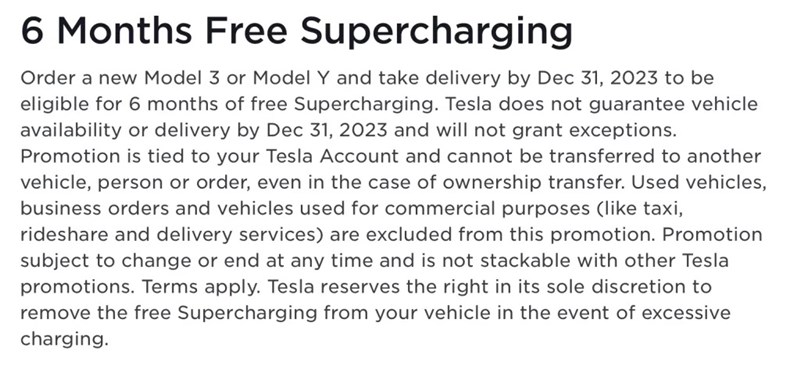 สำหรับเงื่อนไขถือว่าชวนสงสัยไม่น้อย เพราะมีการระบุว่า Tesla ไม่สามารถการันตีได้ว่าจะมีรถยนต์ส่งมอบภายในวันที่ 31 ธันวาคม 2023 หรือไม่ซึ่งบริษัทจะไม่มีการยกเว้นให้ นอกจากนั้น โปรโมชั่นนี้จะไม่ร่วมกับแคมเปญอื่น ส่วนสิทธิ์ในการชาร์จนั้นจะผูกอยู่กับบัญชีผู้ใช้งาน Tesla โดยไม่สามารถถ่ายโอนไปยังรถยนต์คันอื่น หรือถ่ายโอนติดกับพาหนะไปยังผู้ที่ซื้อรถยนต์คันนั้นต่อ