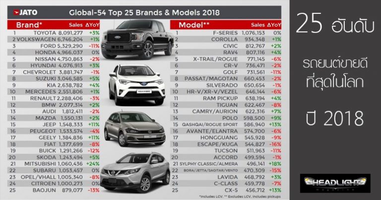 25 อันดับแรก รถที่มียอดขายสูงที่สุดในโลก ประจำปี 2018 จาก 54 ประเทศทั่วโลก