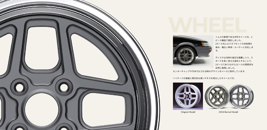 TOYOTA AE86 TOM’S HERITAGE ยังเพิ่มประสิทธิภาพการรีดอากาศด้วยการติดตั้งแผ่นใต้ท้องใหม่ ช่วยให้การขับขี่ดีขึ้น ส่วนล้อสร้างขึ้นใหม่โดยใช้ดีไซน์ดั้งเดิมกับล้อ TOM’S Lattice สี่ก้านคู่ แต่เปลี่ยนจากเดิมที่เป็นชิ้นเดียวขอบ 13 x 5.5 นิ้ว เป็นล้อแบบ 2 ชิ้น ขนาด 15 x 7.5 นิ้ว ทั้งยังออกแบบให้ก้านยาวขึ้น เพื่อทำให้ดูเหมือนล้อชิ้นเดียวแบบเดิม และยังมีฝาปิดดุมล้อโลโก้แบบเก่า ก่อนรัดด้วยยาง Bridgestone POTENZA RE-11RS ขนาด 195/50 R15 ส่วนภายในทั้งเบาะและแผงประตูตัดเย็บด้วยผ้าลายเดิม