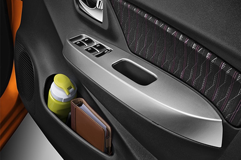 ภายในของ Toyota Agya มาพร้อมกับเบาะนั่งแบบพนักพิงศีรษะปรับเลื่อนไม่ได้ บุแผงประตู