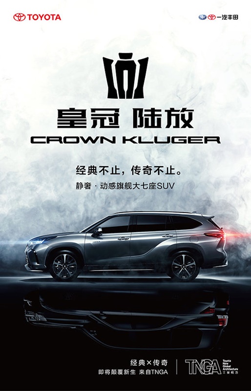 platform ที่ใช้เป็นแบบ TNGA-K สำหรับการเปิดตัวของ Toyota Crown Kluger มีขึ้นที่ประเทศจีน ในงาน Auto Shanghai 2021 ซึ่งจัดตั้งแต่วันที่ 19 เมษายน และจะทำตลาดที่นั่นเท่านั้น โดยเริ่มออกจำหน่ายในช่วงครึ่งหลังของปีนี้ พร้อมวางตำแหน่งทางการตลาดวางให้เป็น flagship SUV ของ FAW Toyota