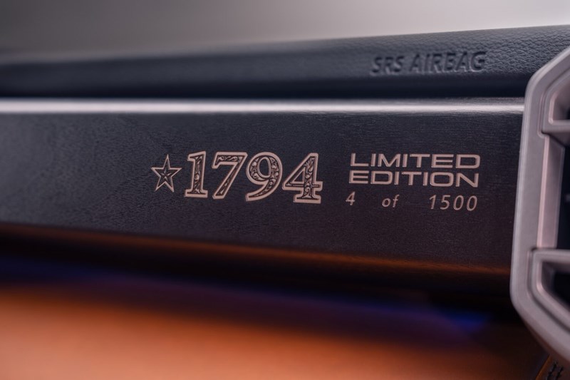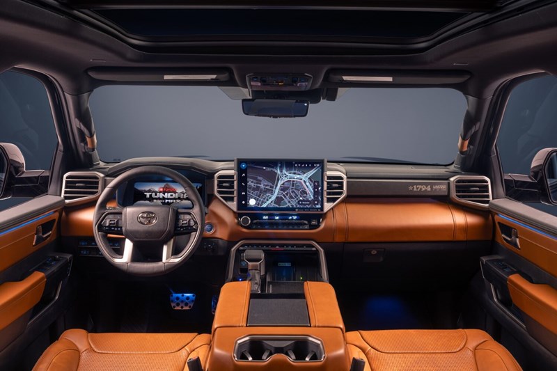 ภายในห้องโดยสารมีการปั๊มชื่อรุ่นพิเศษเช่นกัน ทั้งบนเบาะและแดชบอร์ด ช่วงล่างของ Toyota Tundra 1794 Limited Edition พิเศษกว่าด้วยการยกสูงขึ้นมาอีก 1.1 นิ้ว จากการเปลี่ยนไปใช้โช๊คอัพ FOX® Internal Bypas ขนาดแกน 2.5 นิ้ว เพิ่มขีดความสามารถในการขับขี่แบบ off-road ส่วนสีตัวถังที่มีให้เลือก ประกอบด้วย สีขาว Wind Chill Pearl, สีดำ Midnight Black Metallic, สีน้ำเงิน Blueprint และ สีทองไหม้ Smoked Mesquite