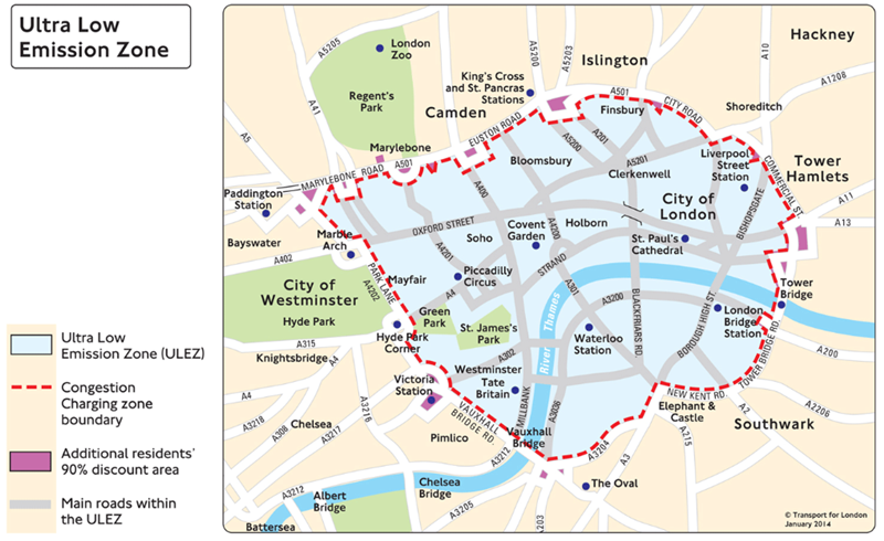 เขต ULEZ หรือ Ultra Low Emission Zone จะมีการจัดตั้งขึ้นในวันที่ 8 เมษายน 2019 และ มีผลบังคับใช้ตลอด 24 ชั่วโมง ใน London โดยระบุว่ายานพาหนะที่จะไม่ถูกปรับเงิน เมื่อขับเข้าไปในเขตดังกล่าว จะต้องมีคุณสมบัติ ดังนี้