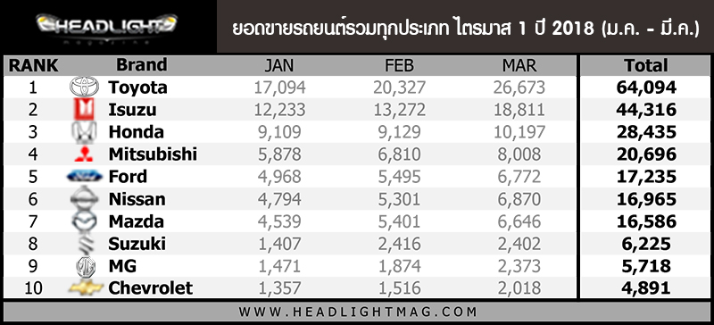 เปรียบเทียบกับช่วงเดียวกันของปีที่ผ่านมา (ไตรมาส 1 เดือน มกราคม – มีนาคม) ปี 2018 เติบโตขึ้นจากเดิม +1.12% แต่อันดับ มีการขยับจากอันดับ 5 เป็น อันดับ 6 โดยแบรนด์ที่ขึ้นมาแทนที่ในอันดับ 5 คือ Ford