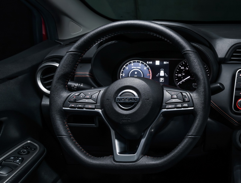 - พวงมาลัยท้ายตัดแบบ D-shape ซึ่งมาแทนพวงมาลัย 3 ก้านหน้าแพะแบบเดิม (อันที่จริง Nissan เริ่มใช้พวงมาลัยดีไซน์ใหม่นี้มาสักพักแล้ว Note และ Almera ไทยที่ขายขณะนี้ก็เช่นกัน)