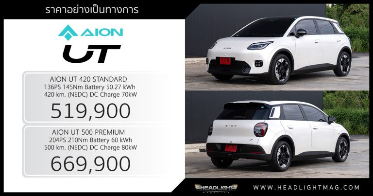 ราคาอย่างเป็นทางการ AION UT AION UT 420 Standard : 519, … อ่านเพิ่มเติม ราคาอย่างเป็นทางการ + เทียบสเป็ค AION UT : 519,900 – 669,900 บาท | แบต 50 – 60kWh วิ่งไกลสุด 500 km. (NEDC)