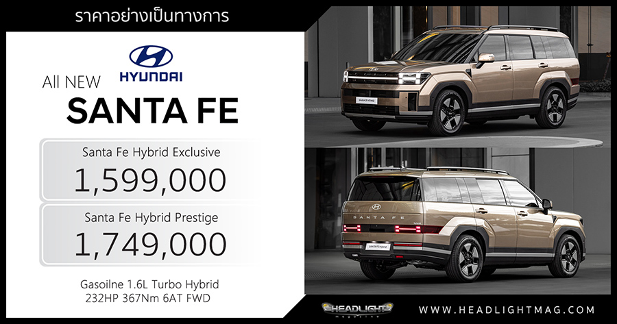 - Santa Fe 1.6 Turbo Hybrid Exclusive : 1,599,000 บาท