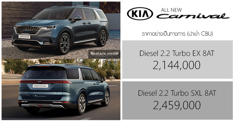 ราคาอย่างเป็นทางการ KIA Grand Carnival Diesel 2.2 LX 8AT : 1,397,000 บาท (ประกอบอาเซียน) : http://www.headlightmag.com/official-price-kia-grand-carnival-lx-asean-thailand/