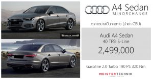 Audi A4 Sedan 40 TFSI S-Line MINORCHANGE ราคาอย่างเป็นท … อ่านเพิ่มเติม ราคาอย่างเป็นทางการ Audi A4 Sedan 40 TFSI S-Line : 2,499,000 บาท (นำเข้า CBU)
